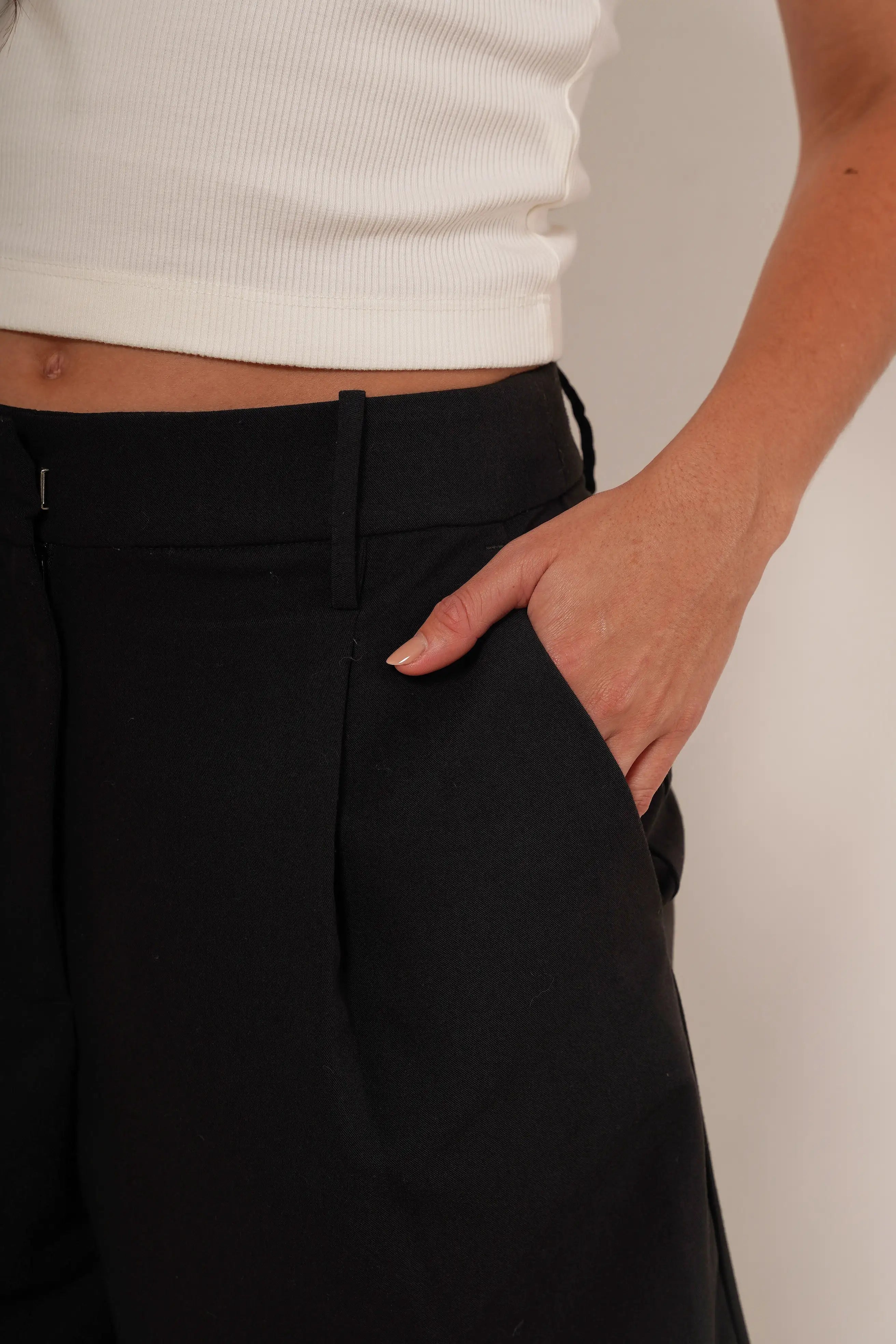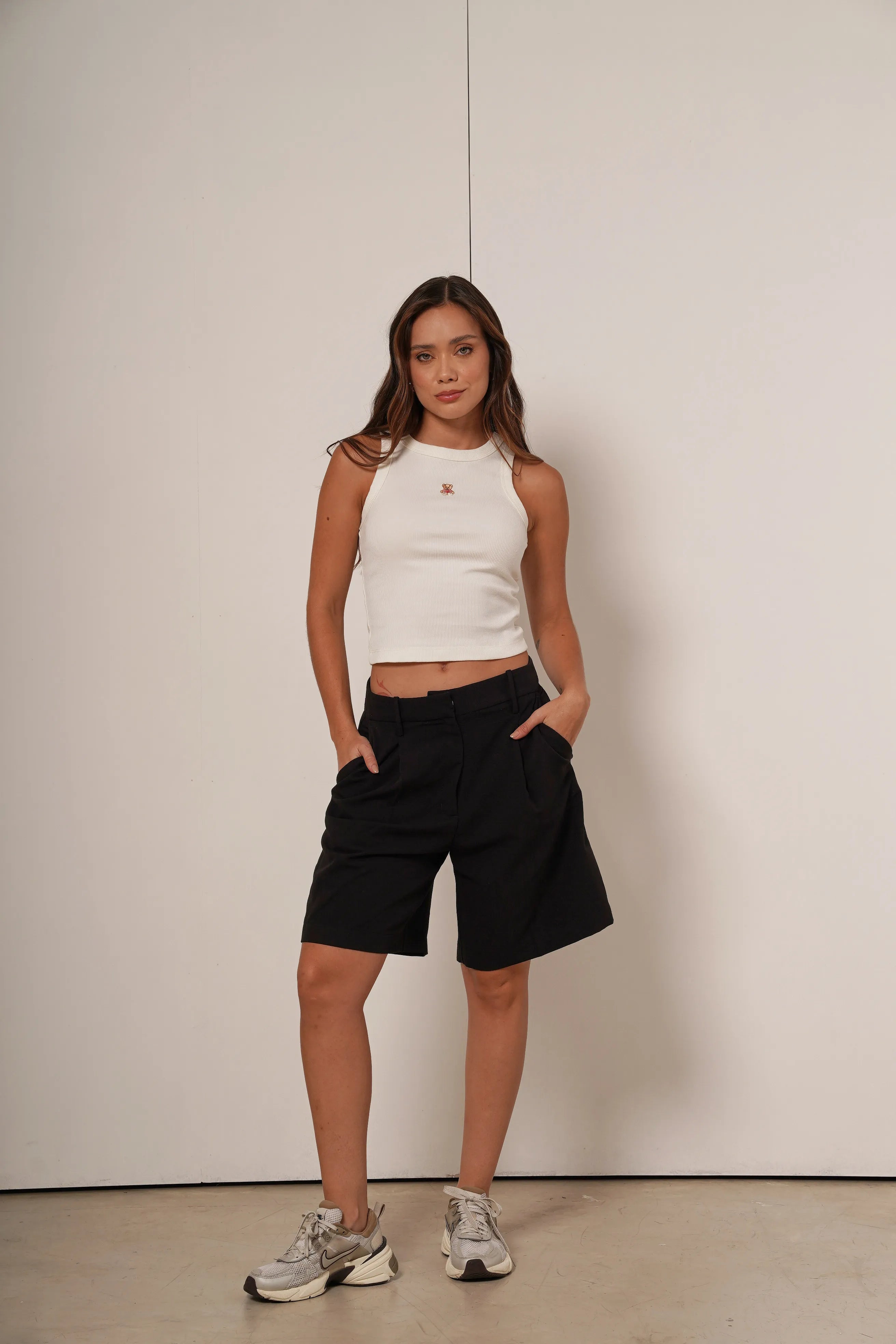 Bermudas inspiradas en la sastrería tradicional, Tiro alto y cintura con trabillas. Bolsillos delanteros, Detalle de raya planchada en delantero. Cierre frontal con cremallera, botón y gancho metálico.
