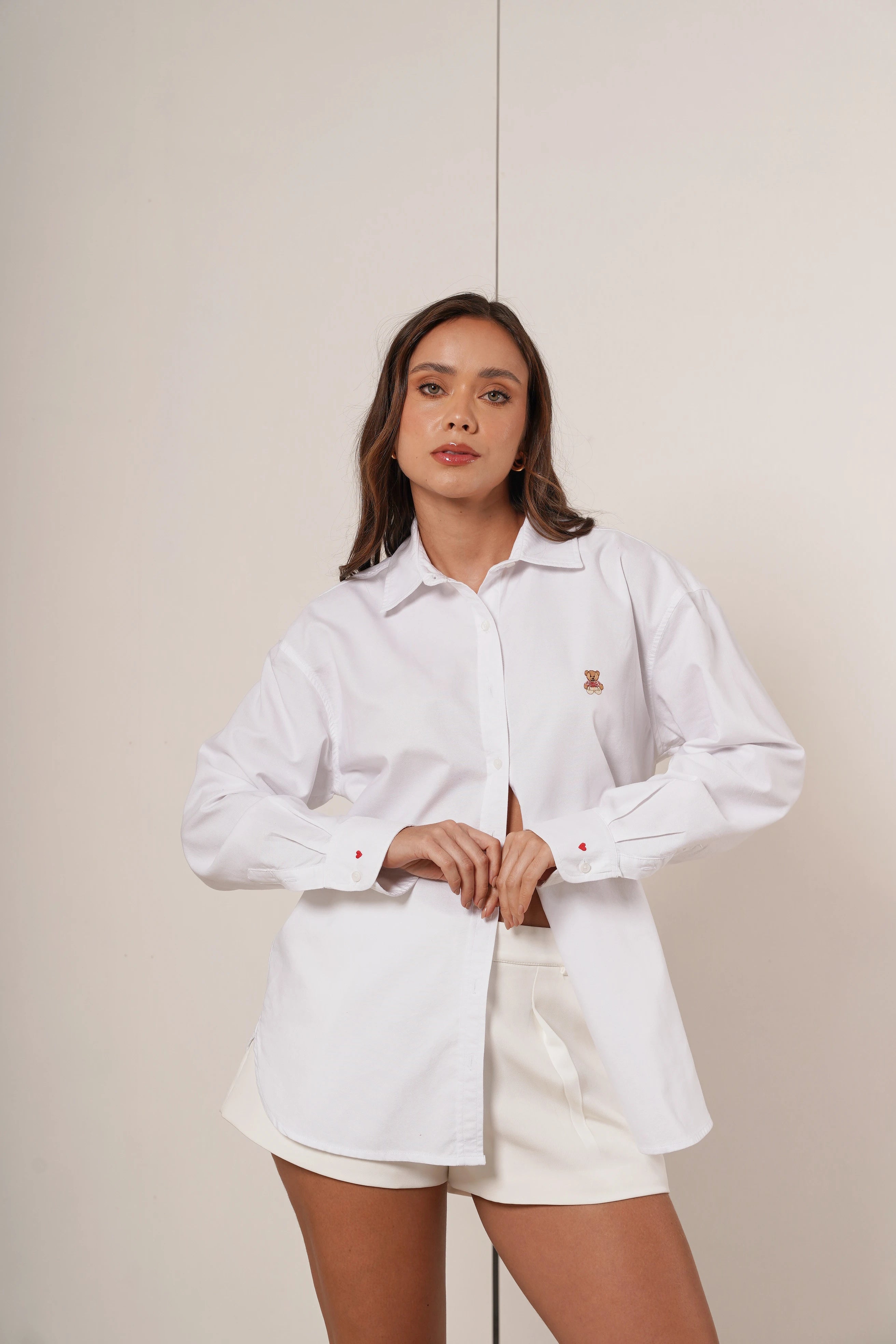 Camisa blanca de botones tipo Oxford, confeccionada en 100% algodón de alta calidad, ofrece un ajuste oversized, El toque especial está en su delicado bordado de teddy y finos corazones bordados en las mangas que transmiten un sutil romanticismo.