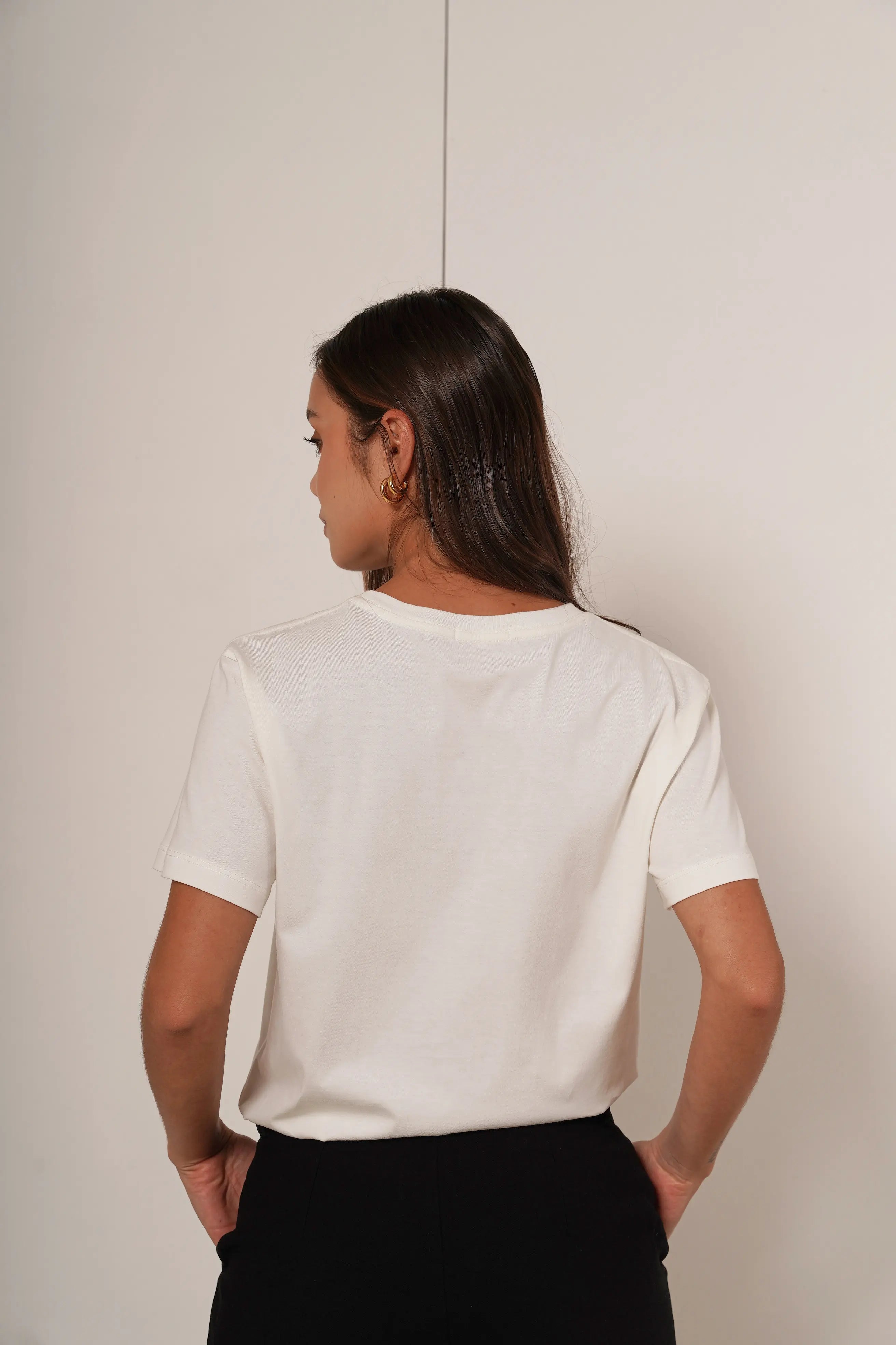 Confeccionada en 100% algodón, brinda suavidad y frescura al tacto. Su corte recto cae naturalmente hasta la cadera, mientras que el cuello redondo en contraste y las mangas cortas aportan un acabado versátil.
