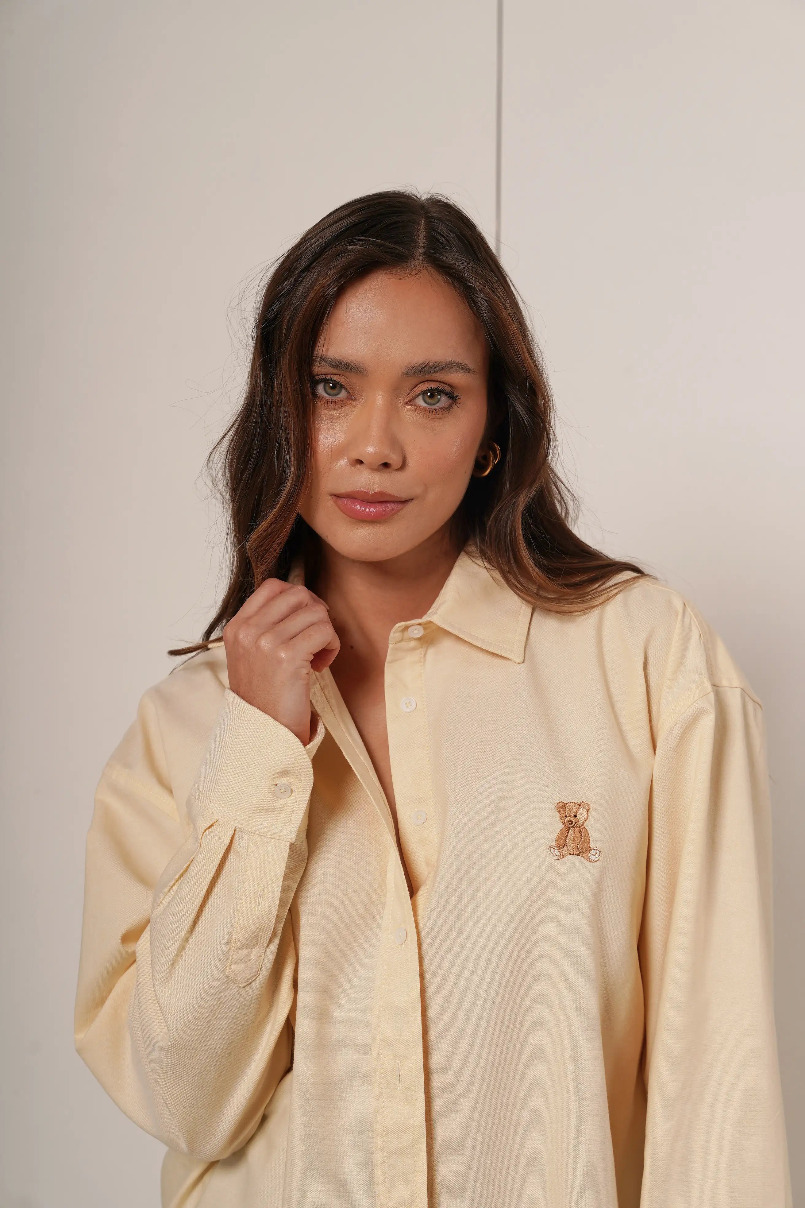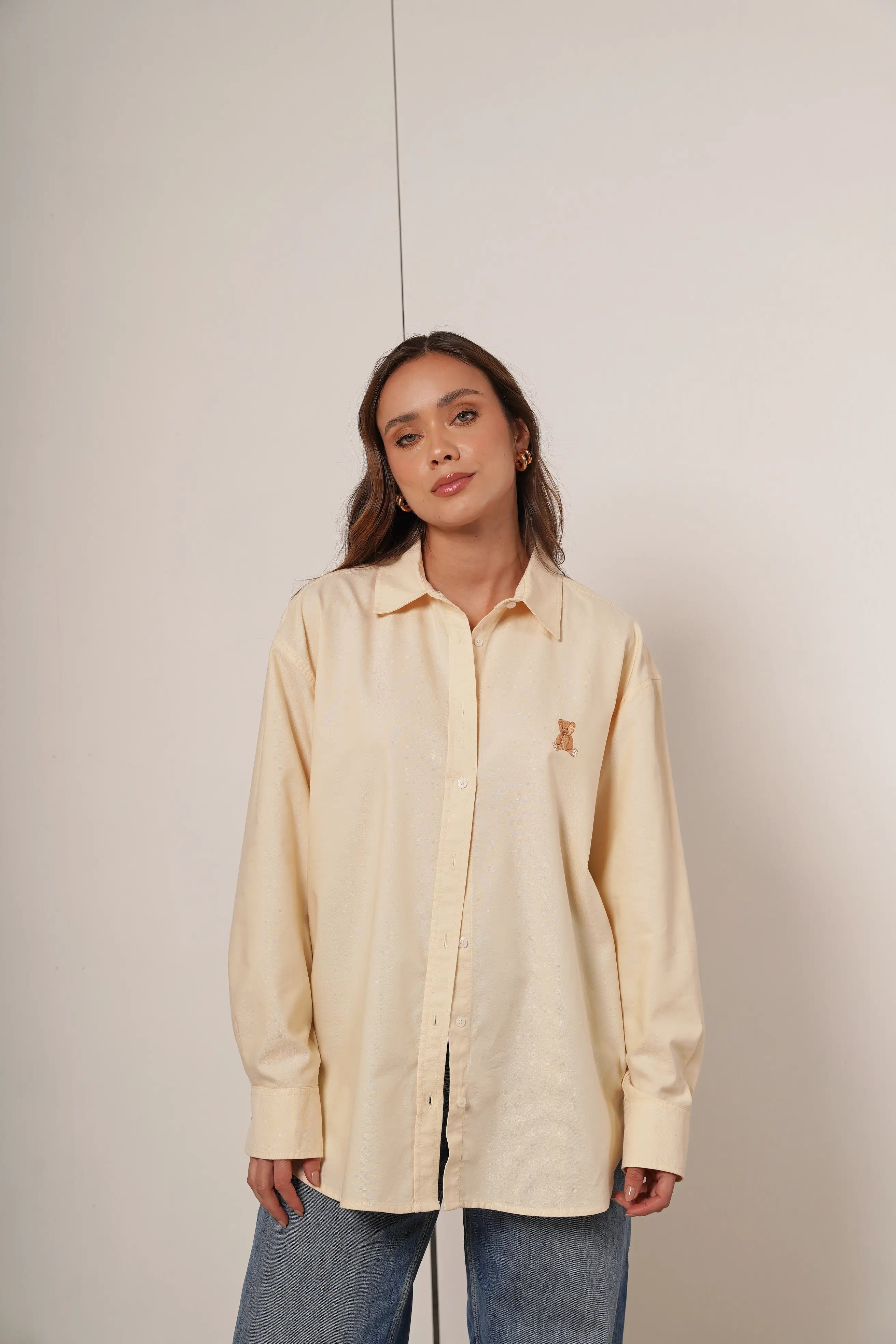 Nuevo color Butter Yellow 💛 camisa de botones tipo Oxford, confeccionada en 100% algodón de alta calidad, ofrece un ajuste oversized, El toque especial está en su delicado bordado de teddy que transmite un sutil romanticismo.